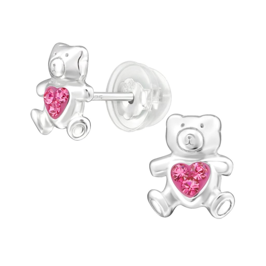 Dopřejte své malé princezně šperk, který kombinuje dětskou roztomilost s prvotřídní kvalitou. Tyto náušnice ve tvaru medvídků jsou symbolem jemnosti a bezpečí, navržené speciálně pro ty nejmenší. Každý medvídek nese na bříšku zářivé srdíčko vysázené růžovými kameny, které se krásně třpytí a dodávají šperk dívčí půvab. Náušnice jsou bezpečným puzetovým zapínáním s plastovou koncovkou (motýlkem), která netlačí a zajišťuje pohodlné nošení po celý den.